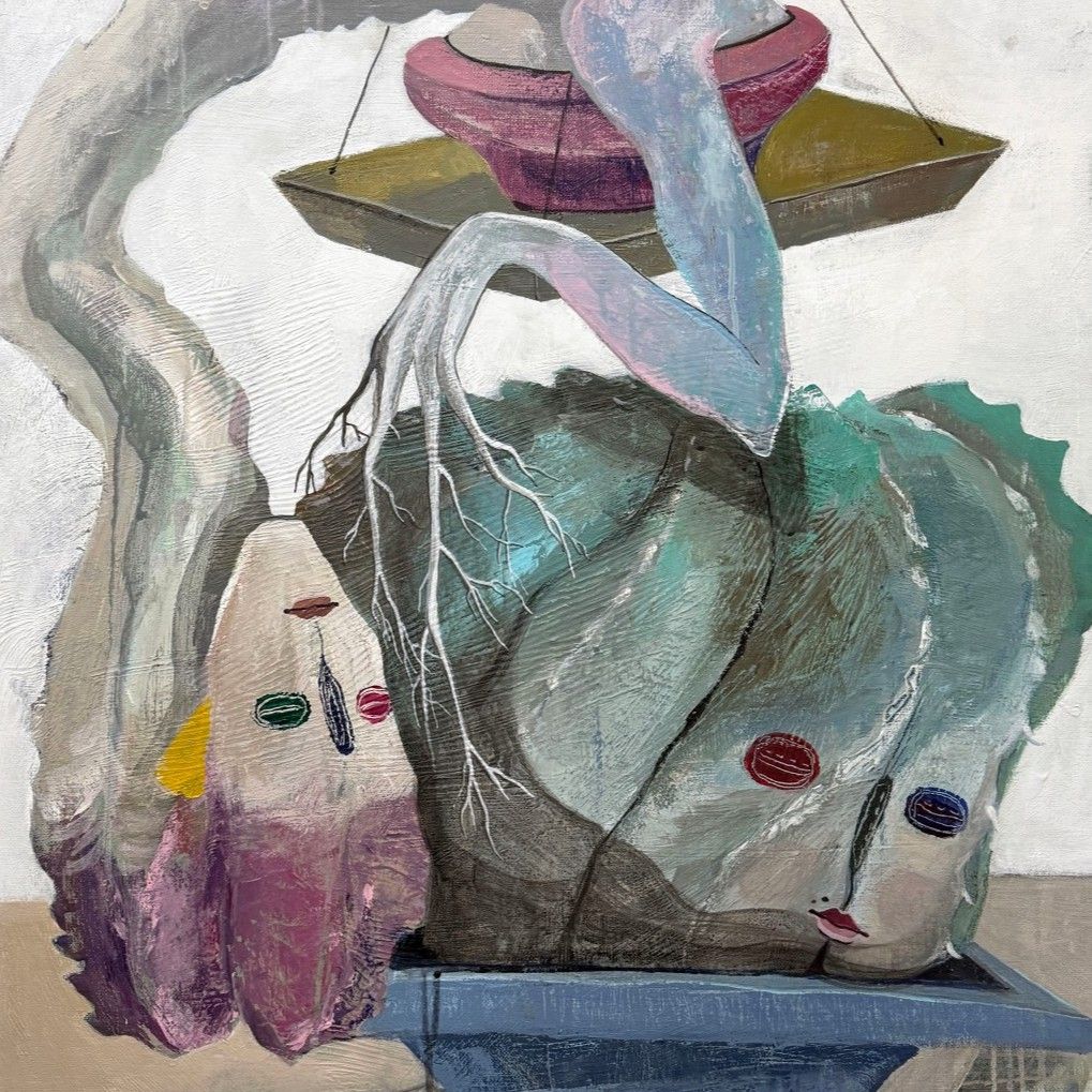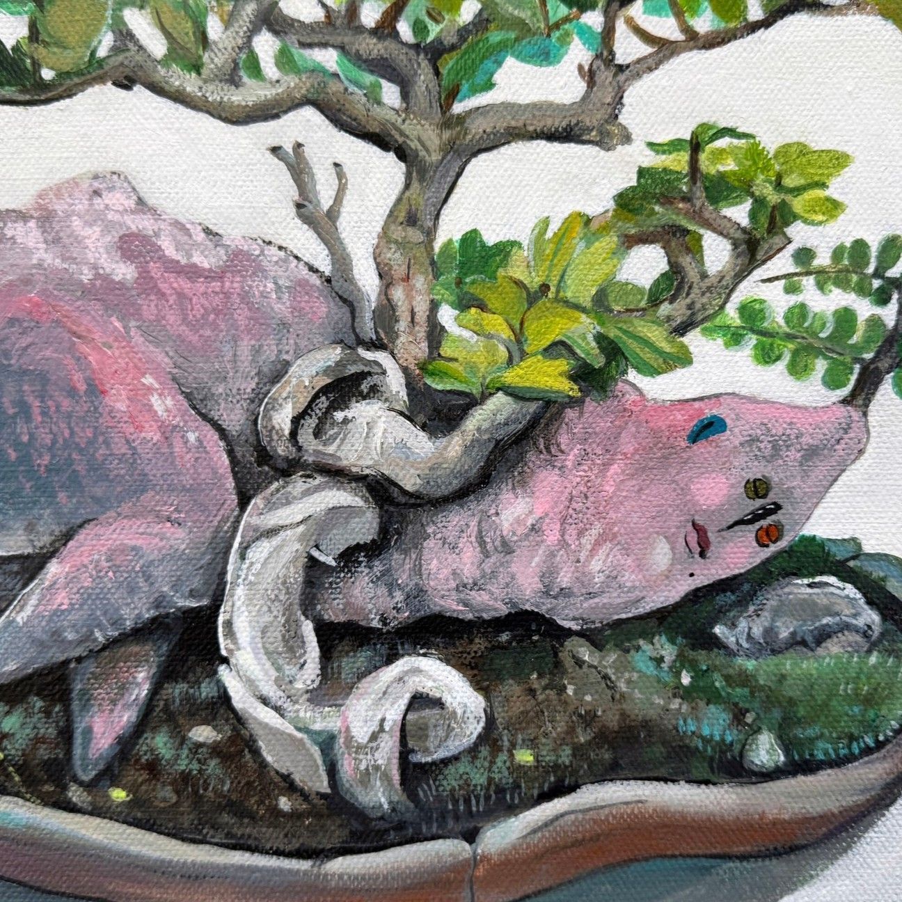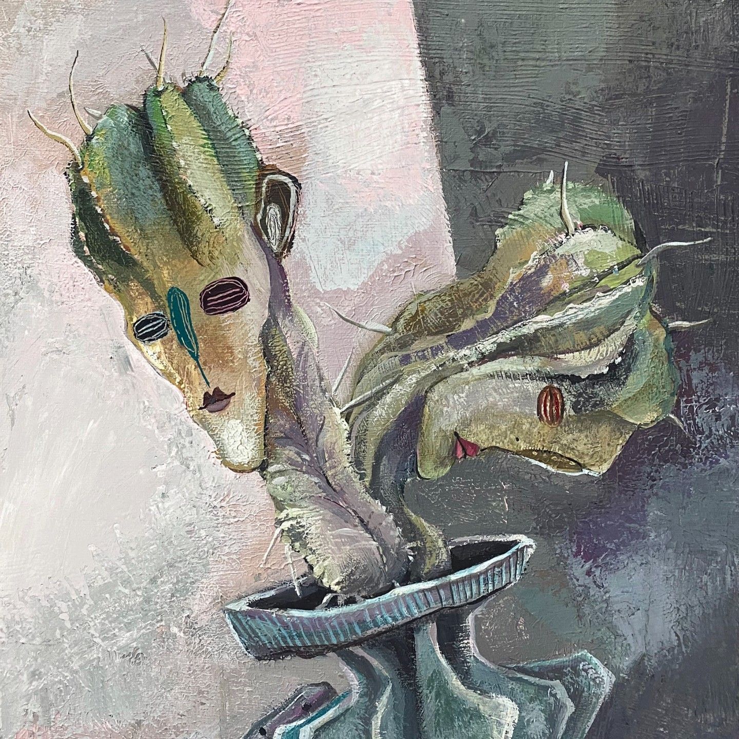 view more…何稼春(1999-),現就讀於國立臺南大學視覺藝術與設計學系碩士班,專注於壓克力創作。 他的創作以自創角色「盆栽人」為核心,探討人類在社會框架下的生存狀態與內心世界。作品中經常出現的「盆栽」元素,不僅具象描繪植物,更象徵個體在社會規範與文化束縛下的處境,將人們在社會中的生存樣貌投射於畫布之上。 藝術家將盆栽比擬為社會框架,植物看似自由生長,卻受限於容器與外在環境;如同每個人自幼便無形或有形地受制於各種規範,影響未來的成長與發展。 何稼春主要以壓克力顏料創作,憑藉其速乾特性迅速捕捉靈感,和他率性直觀的創作習慣相得益彰。目前的作品風格輕鬆而抒情,著重畫面美感,但他期許未來能更深入探討社會框架對個體的影響,回歸創作初衷,更真摯地傳達內在情感、激發觀者與作品間的深層對話。