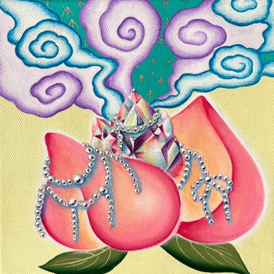 在作品的構圖上,韻軒將供果安排在畫面中央,營造出莊重而神聖的儀式感。層層交疊的桃子高踞寶座之上,如同一份誠摯的獻禮,傳遞內心的敬意與祝福。透過這件作品,黃韻軒邀請觀者共鳴,感受那份對美好境界的嚮往與敬仰。