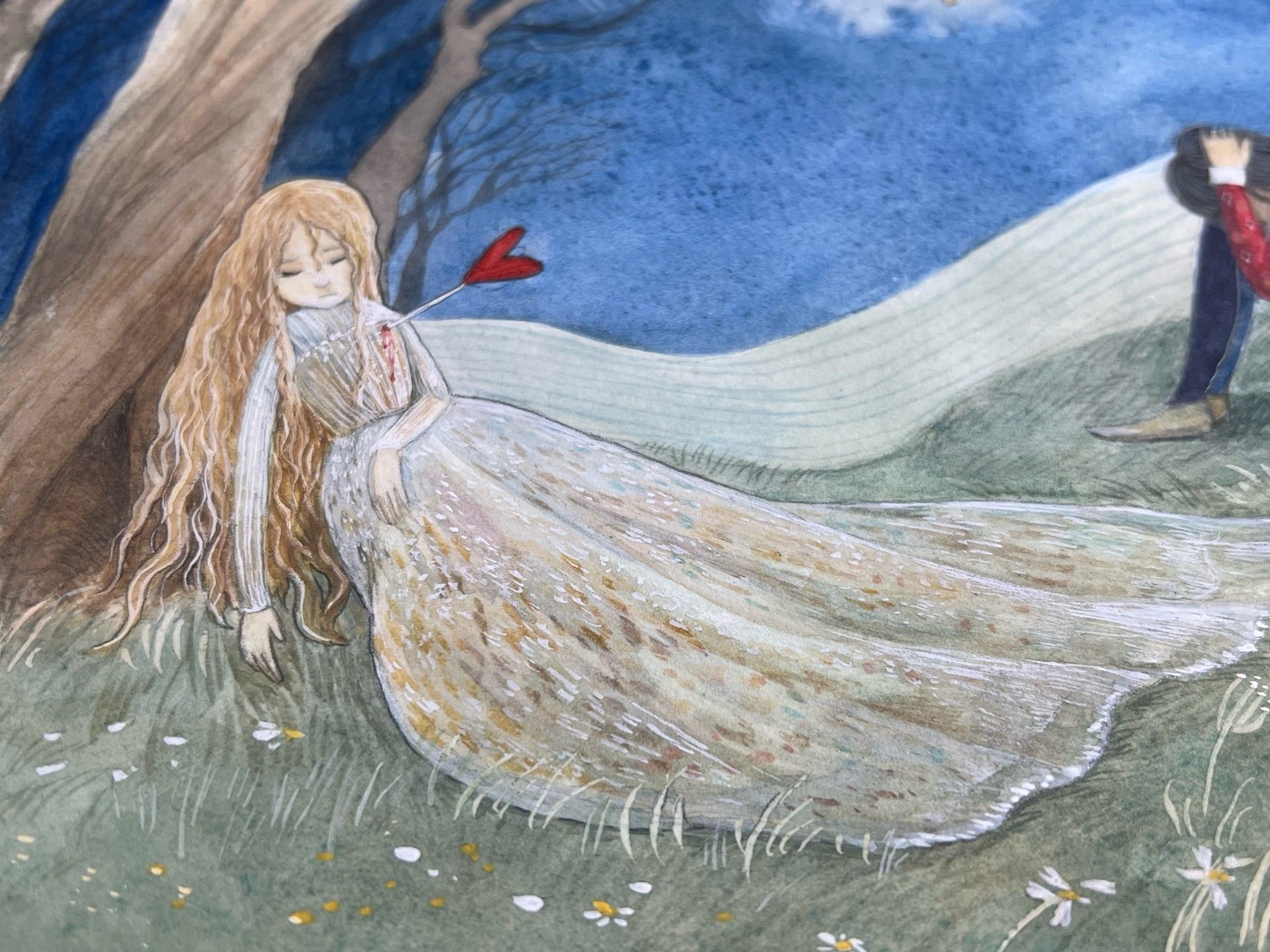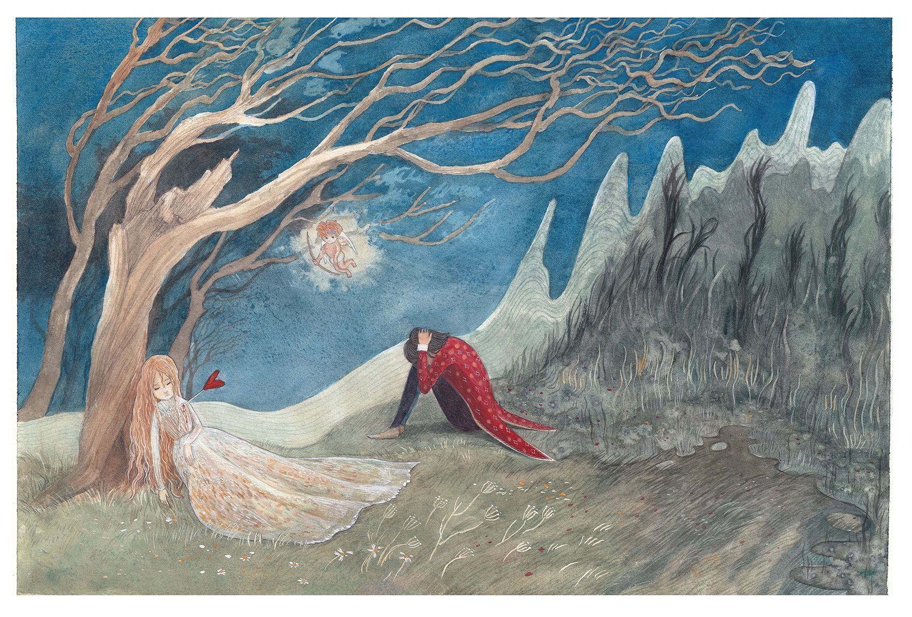 愛會讓人覺得快樂,但有時候,愛也會讓人覺得沉重呢。畫中邱比特一箭射進女子的心臟,因刺的太深而開始滲血,男子則後悔這份過於沈重的愛傷害了女子。絕望在他身後形成潮濕、扭曲的山丘,一步步的侵蝕他的全部。臥躺在枯樹下的女子,雖然還關愛著他,卻無法再幫助他。