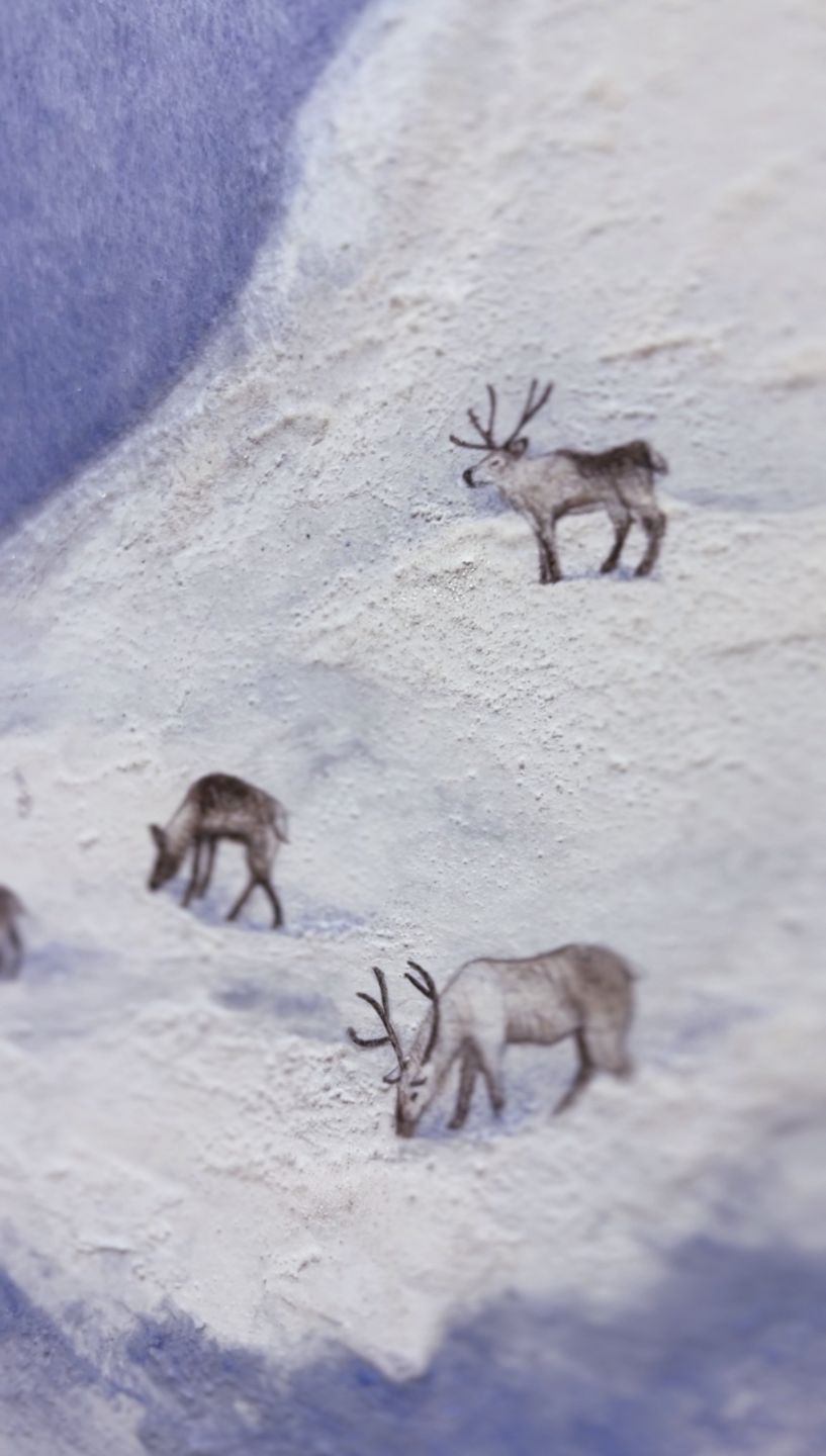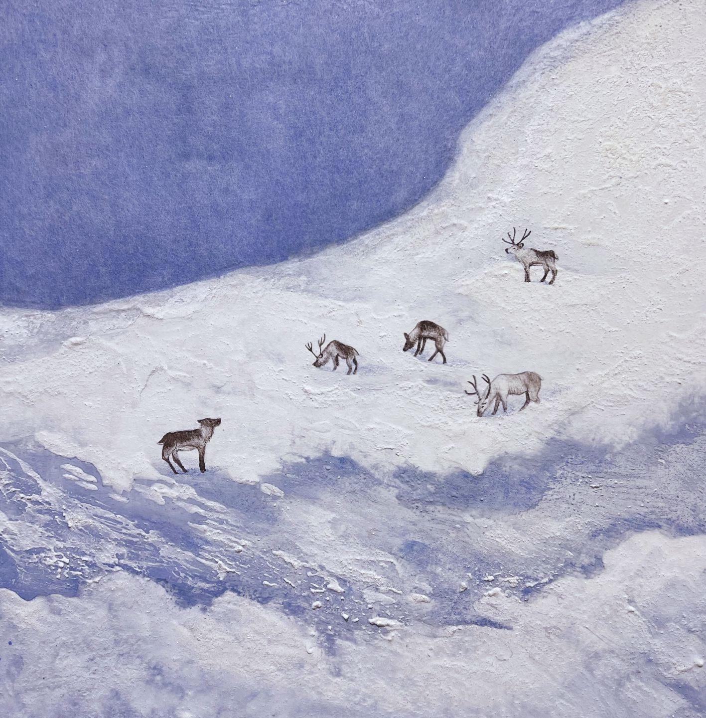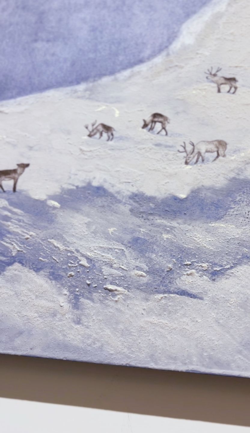 在冰島的旅途中,藝術家偶遇一群覓食中的麋鹿。他們正在酷寒的雪地中散步,翻找著埋藏在雪地下的乾草。畫面中運用雪白和清透的藍色,呈現明亮清新的氣息。棕色與灰色的麋鹿點綴其中,遠看就像是一幅別出心裁的抽象風景一般。