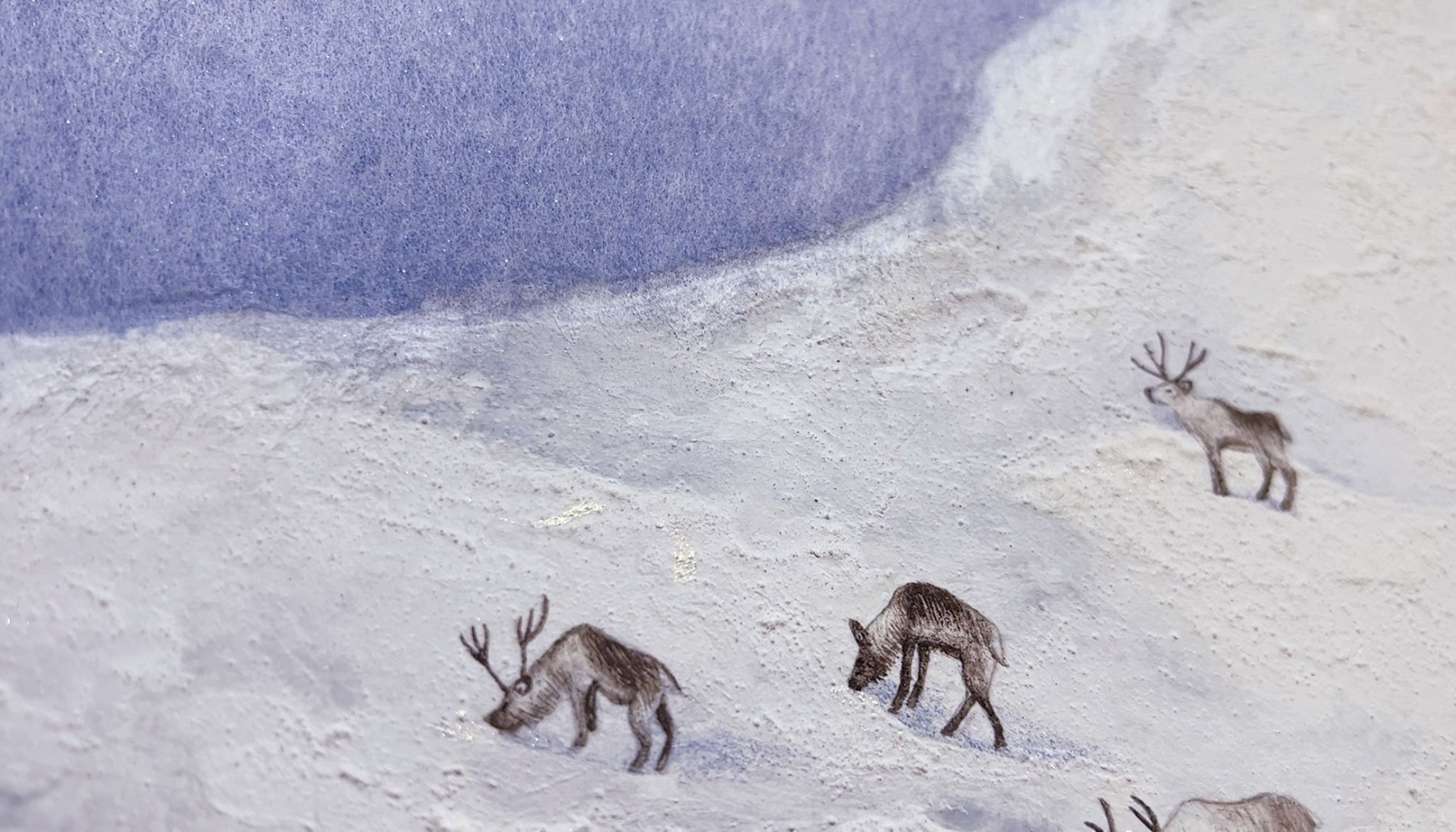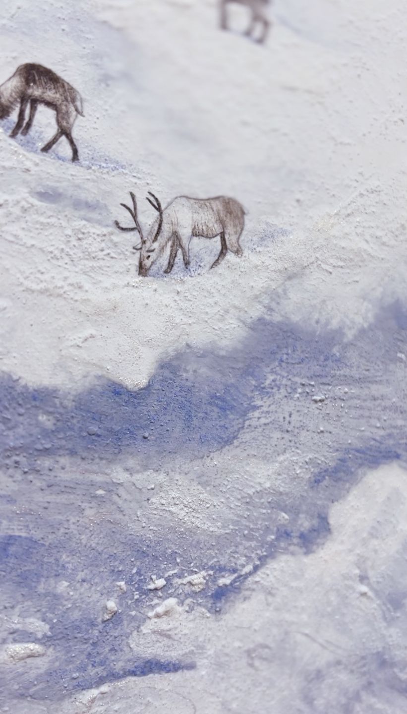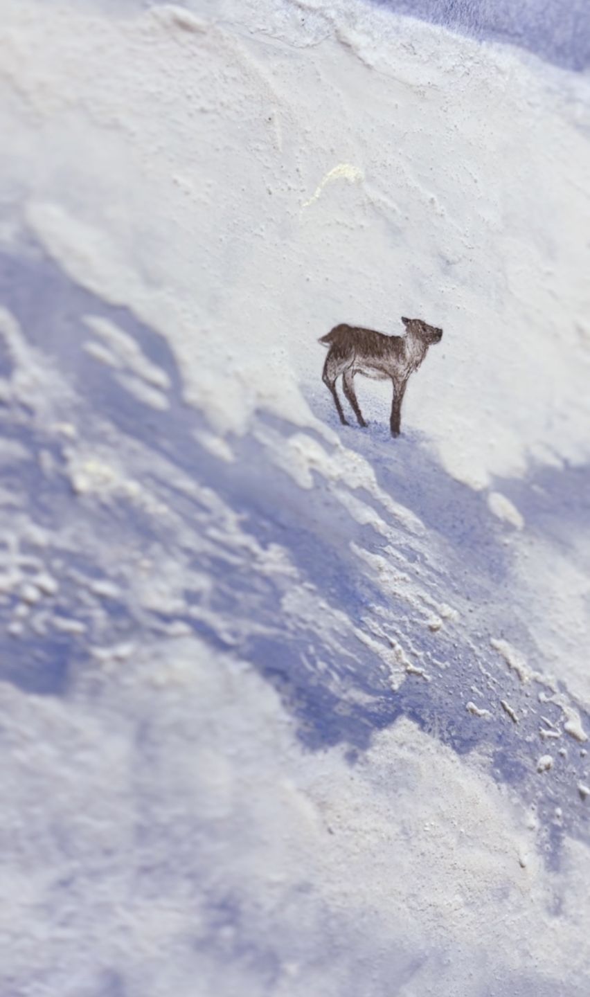 在冰島的旅途中,藝術家偶遇一群覓食中的麋鹿。他們正在酷寒的雪地中散步,翻找著埋藏在雪地下的乾草。畫面中運用雪白和清透的藍色,呈現明亮清新的氣息。棕色與灰色的麋鹿點綴其中,遠看就像是一幅別出心裁的抽象風景一般。
