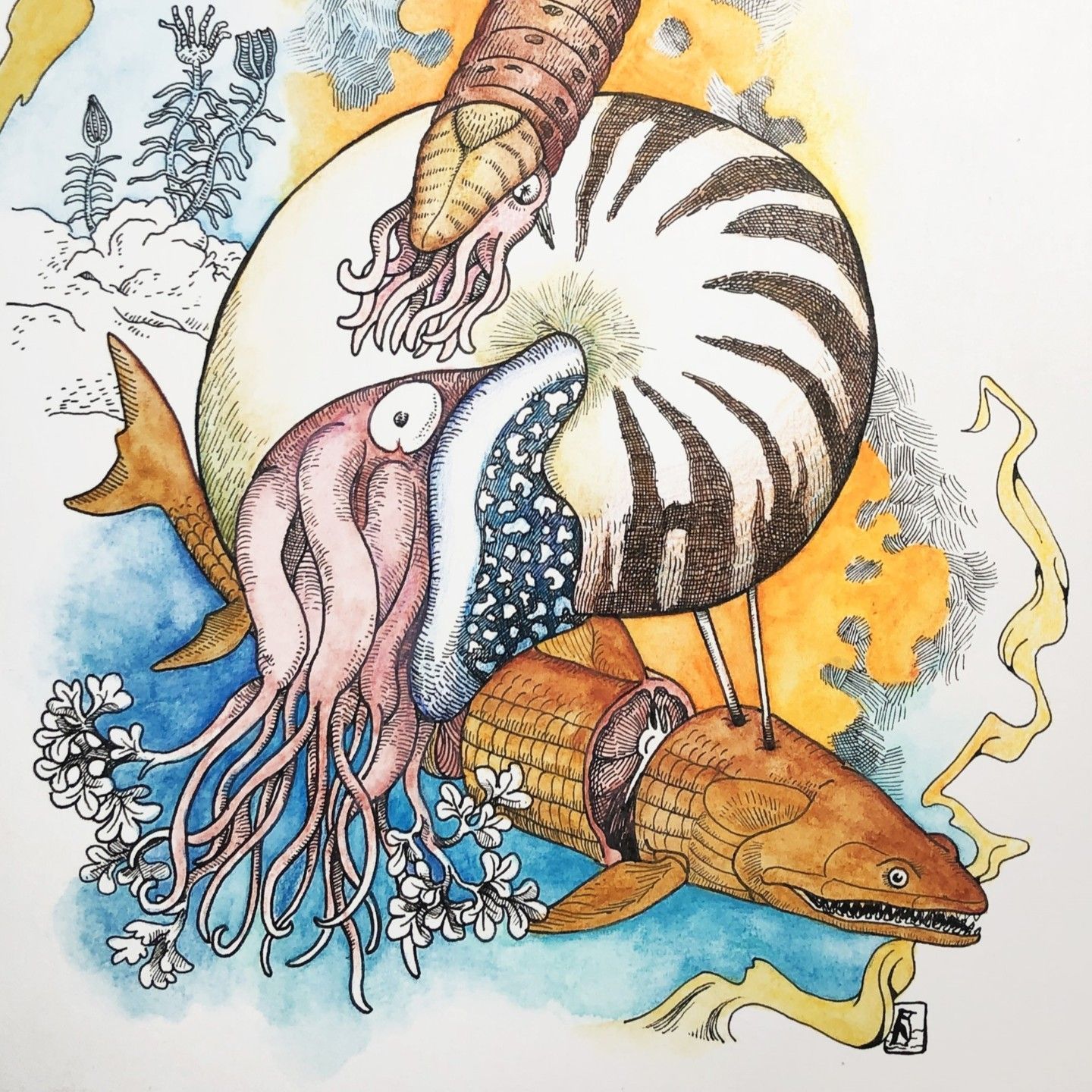 view more…鄭盛謙 (1997-) 畢業於台灣師範大學設計學系,擅長以代針筆與色鉛筆搭配創作,呈現豐富的細節與畫面。 藝術家的創作靈感來自18-19世紀的科學繪畫版畫,當時的科學家與畫家會根據出土的骨骼化石,揉合自己的想像,描繪出如恐龍、鯨魚等動物的身體,創作出介於科學與幻想之間的怪物造型。這種游離於真實與幻想的型態讓鄭盛謙深深著迷,也影響他創作中乍看寫實卻又超現實的特殊風格。 這系列作品源自鄭盛謙的圖像小說《1001:古生物晚宴菜》,藝術家想像在虛構的時代探險家們利用時光機穿梭古生物時代,獵捕古生物並繪製成食譜,一方面討論食物的意義,一方面呈現人類對古生物的好奇與探索。