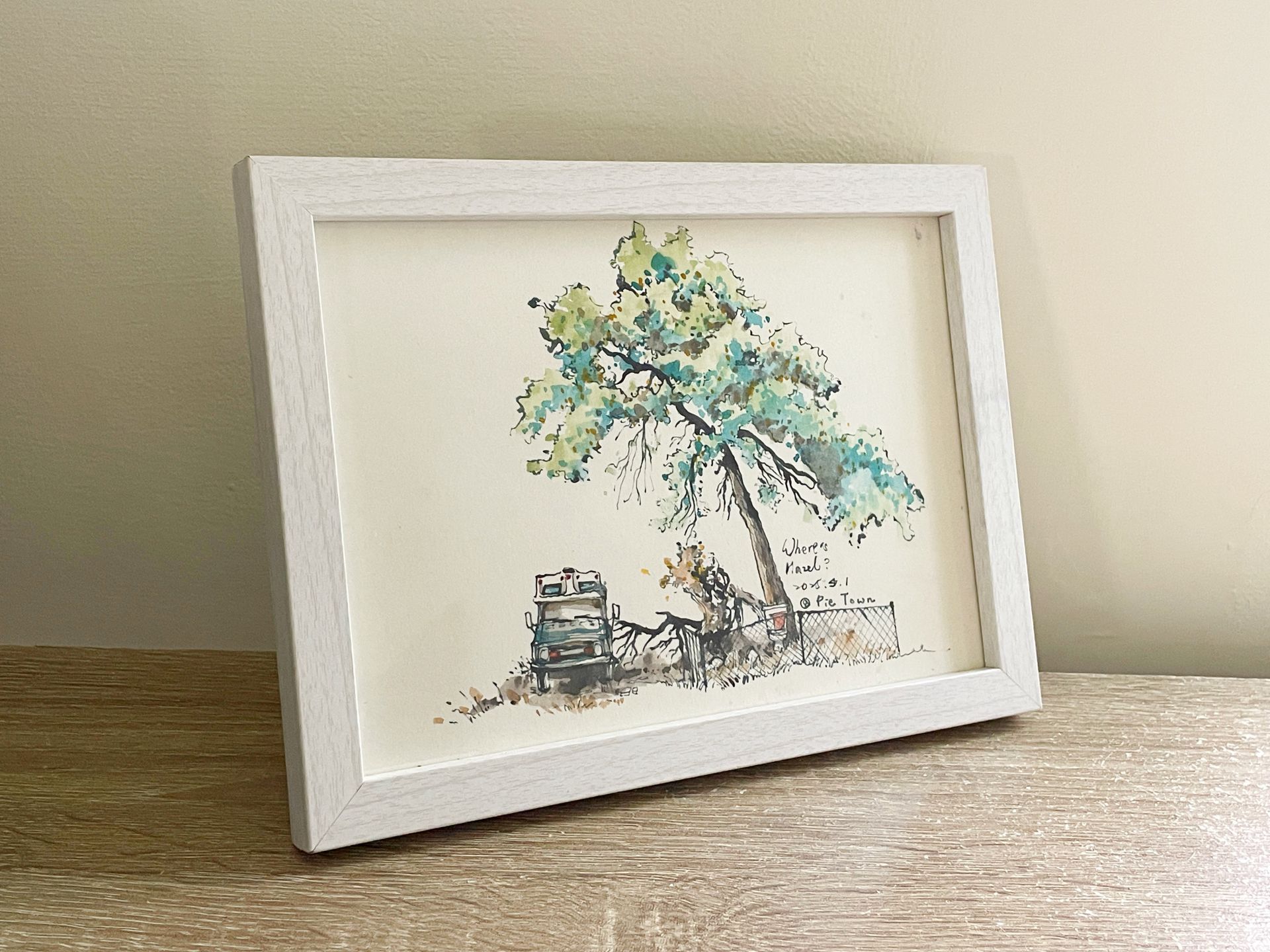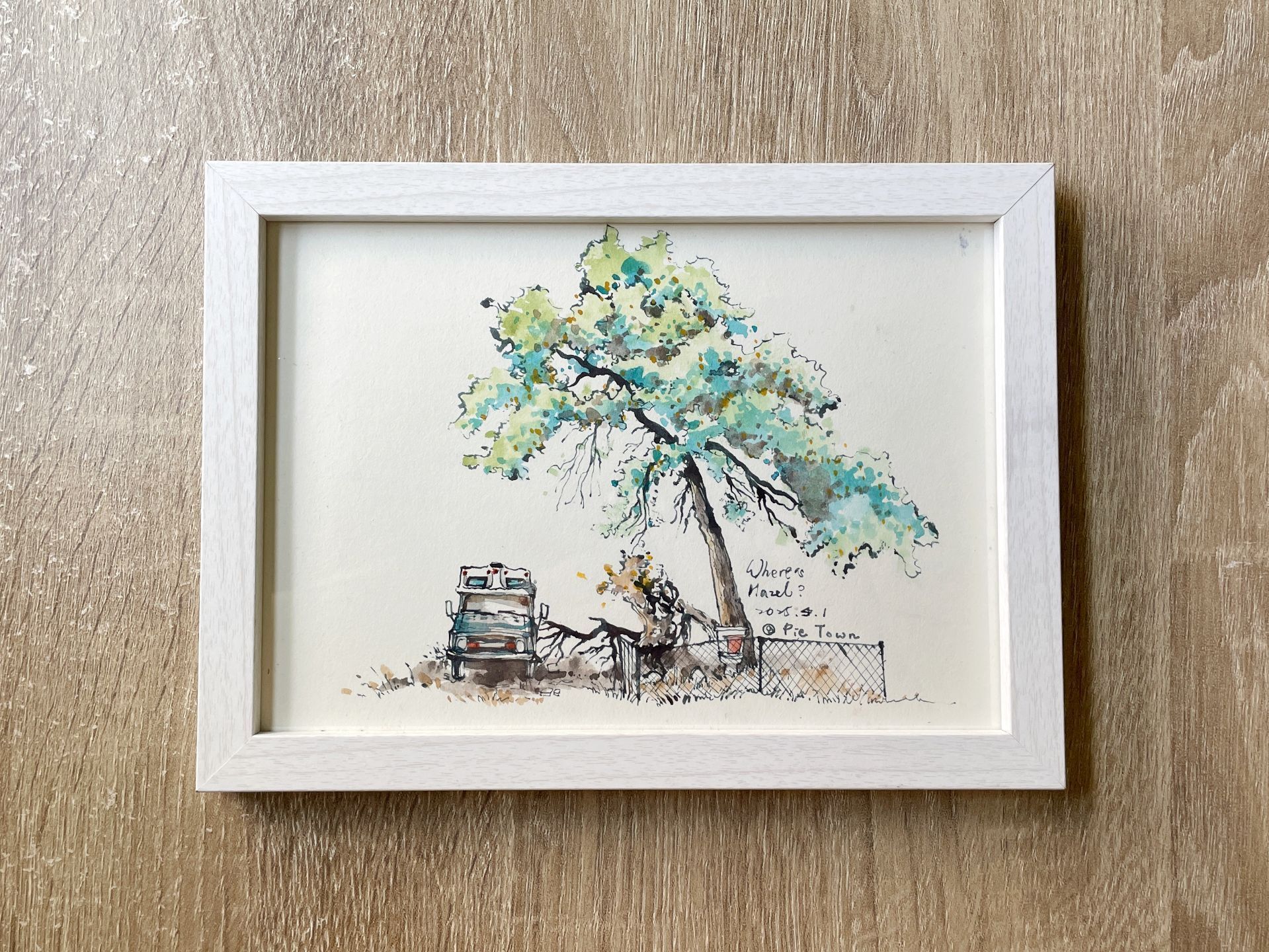 鴨寶偏愛描繪眼前實際存在的景物,那些健行路上的樹木、瀑布、山巒都是她親自走訪,一步一步創造的邂逅。這張美國CDT步道的速寫描繪了小鎮Pie Town,這些來自於個人最真切的觀察,讓異國風情與旅行中的新奇冒險也躍然紙上。
