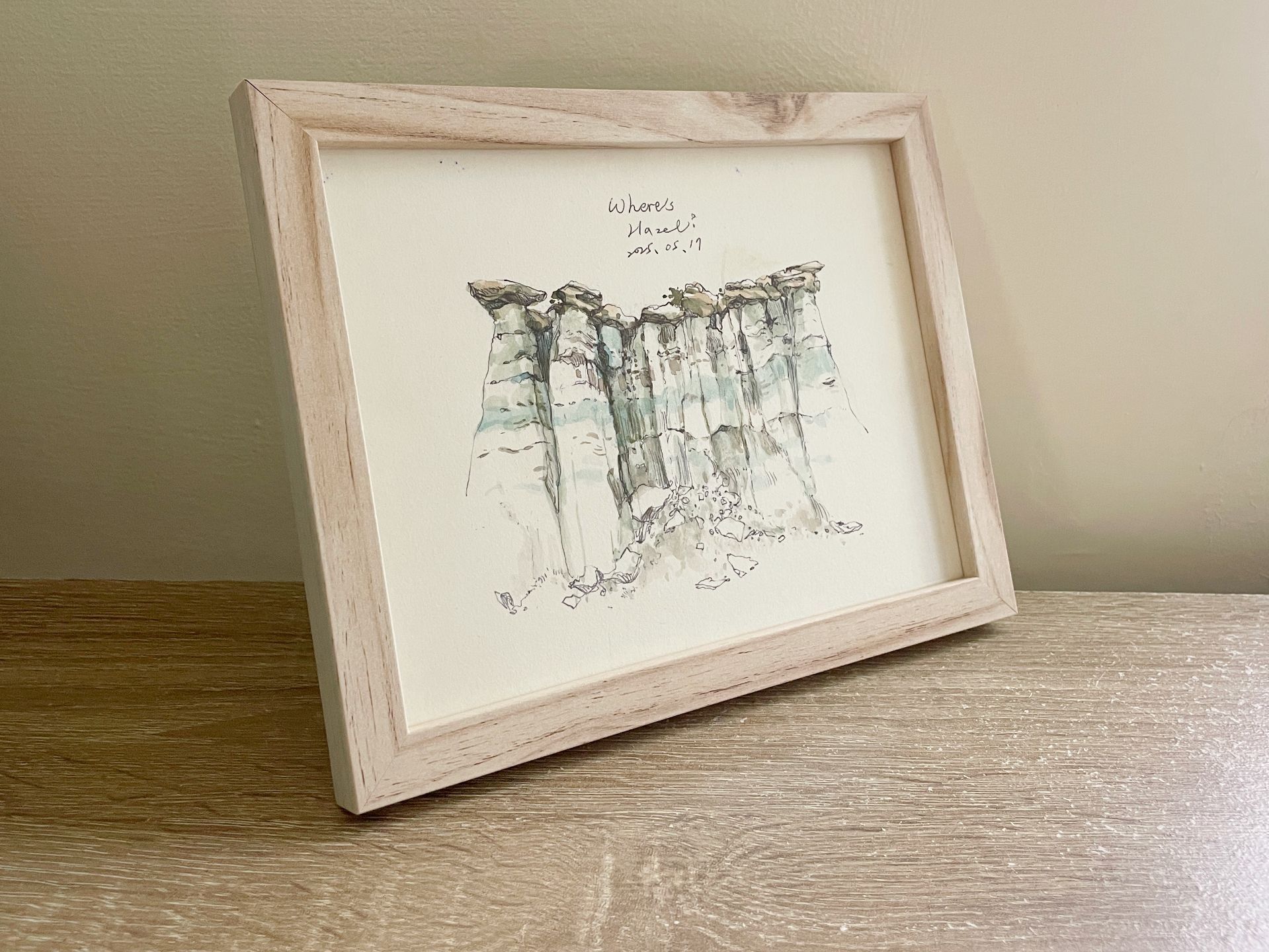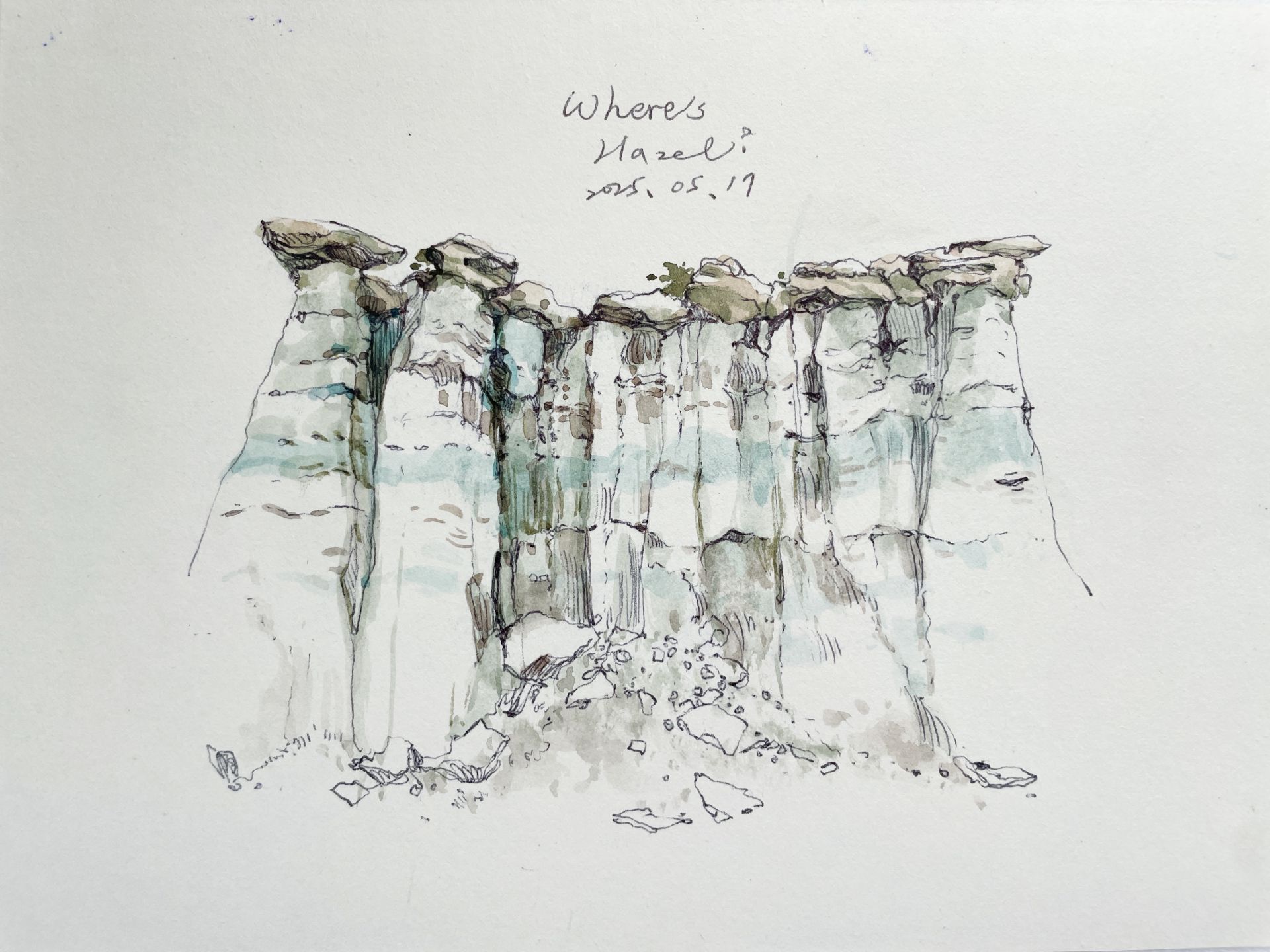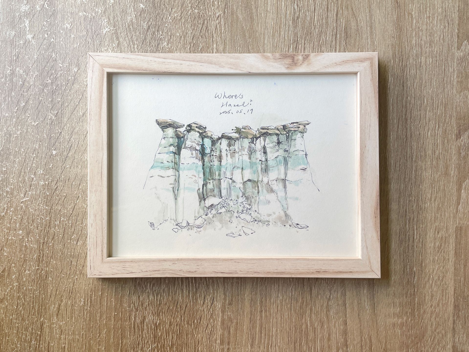 鴨寶偏愛描繪眼前實際存在的景物,那些健行路上的樹木、瀑布、山巒都是她親自走訪,一步一步創造的邂逅。這張美國CDT步道的速寫描繪了眼前特殊的地貌景象,這些來自於個人最真切的觀察,讓異國風情與旅行中的新奇冒險也躍然紙上。