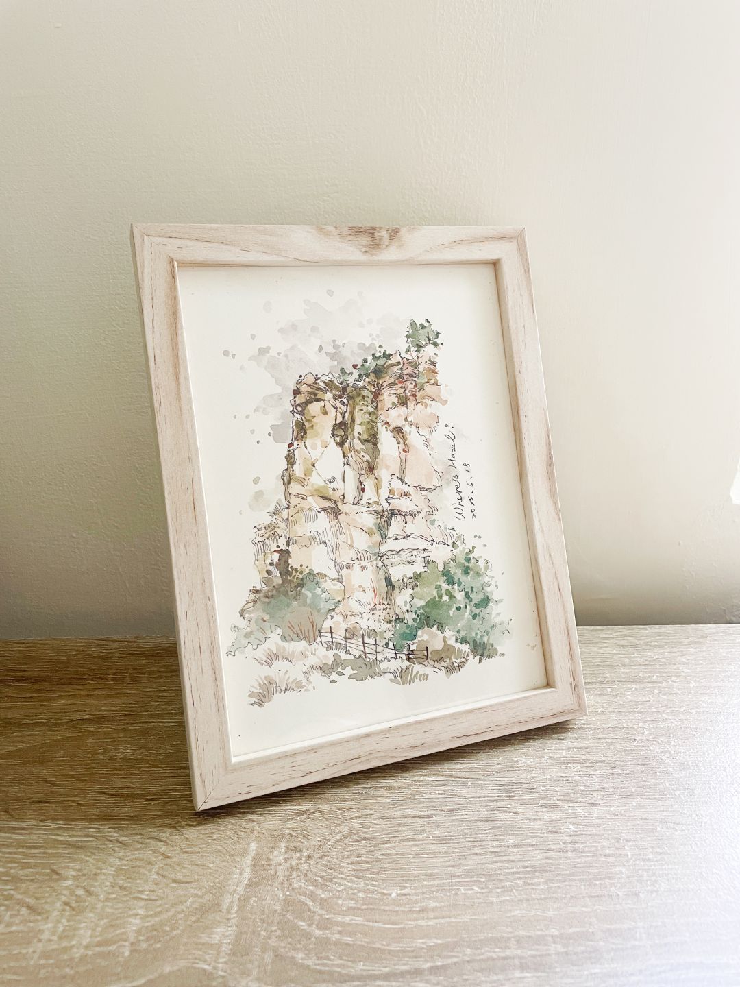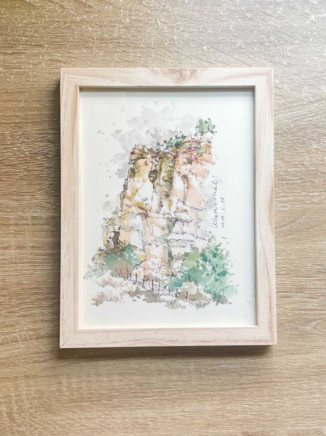 鴨寶偏愛描繪眼前實際存在的景物,那些健行路上的樹木、瀑布、山巒都是她親自走訪,一步一步創造的邂逅。這張美國CDT步道的速寫描繪了眼前壯麗的特殊地景,這些來自於個人最真切的觀察,讓異國風情與旅行中的新奇冒險也躍然紙上。