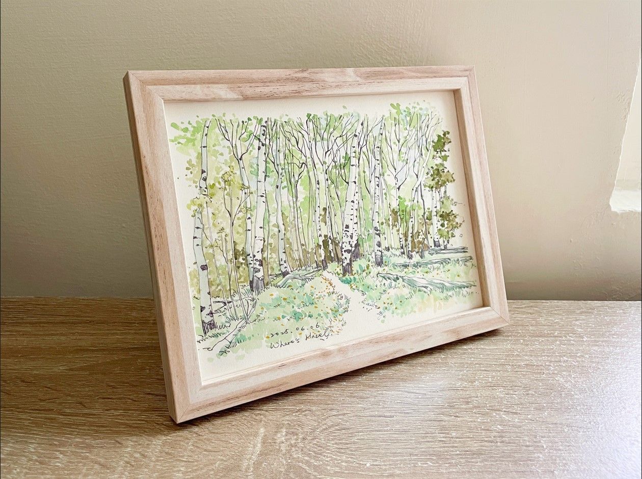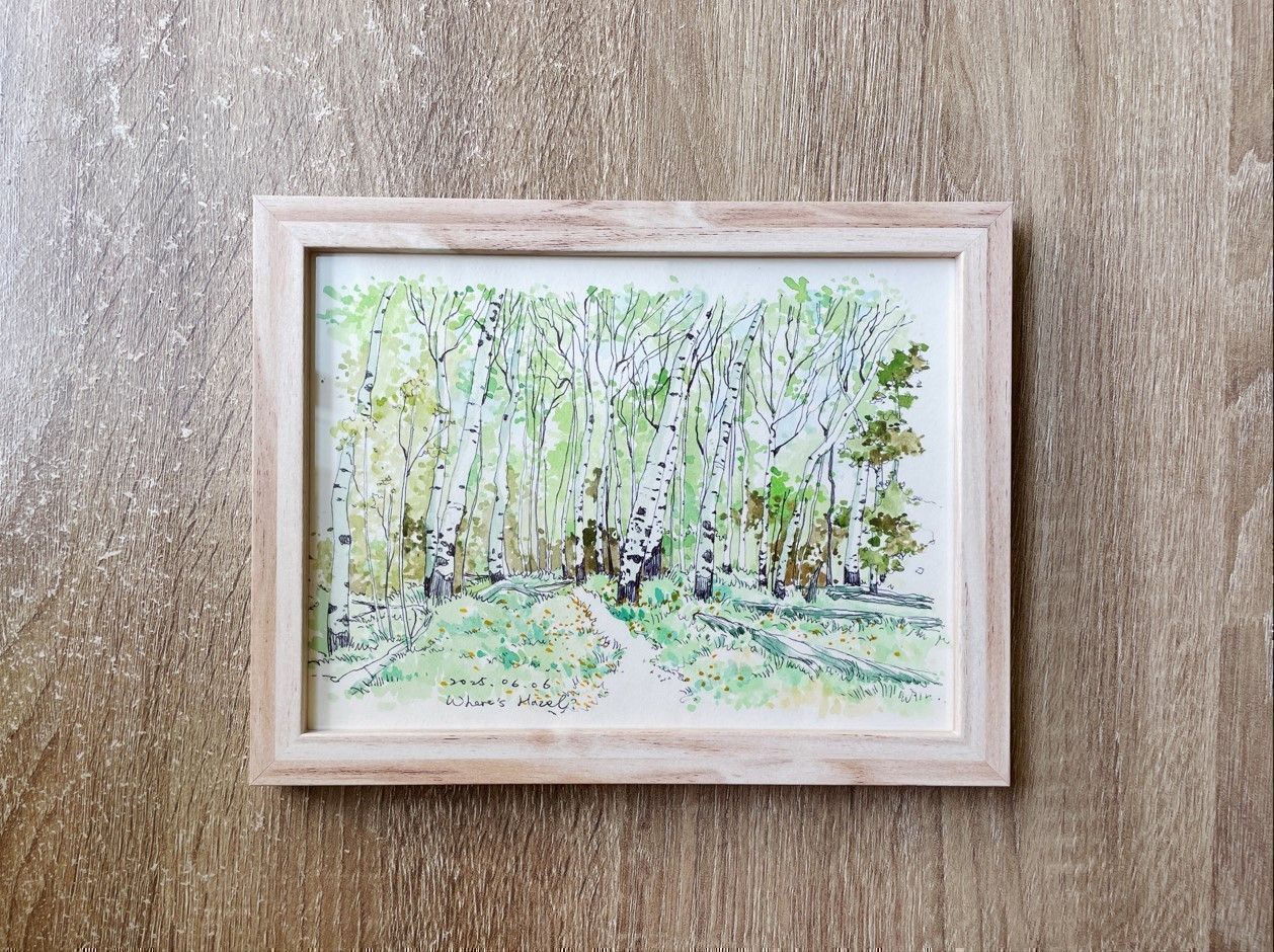 鴨寶偏愛描繪眼前實際存在的景物,那些健行路上的樹木、瀑布、山巒都是她親自走訪,一步一步創造的邂逅。這張美國CDT步道的速寫描繪了步道沿途風景,欣欣向榮的景象,這些來自於個人最真切的觀察,讓異國風情與旅行中的新奇冒險也躍然紙上。