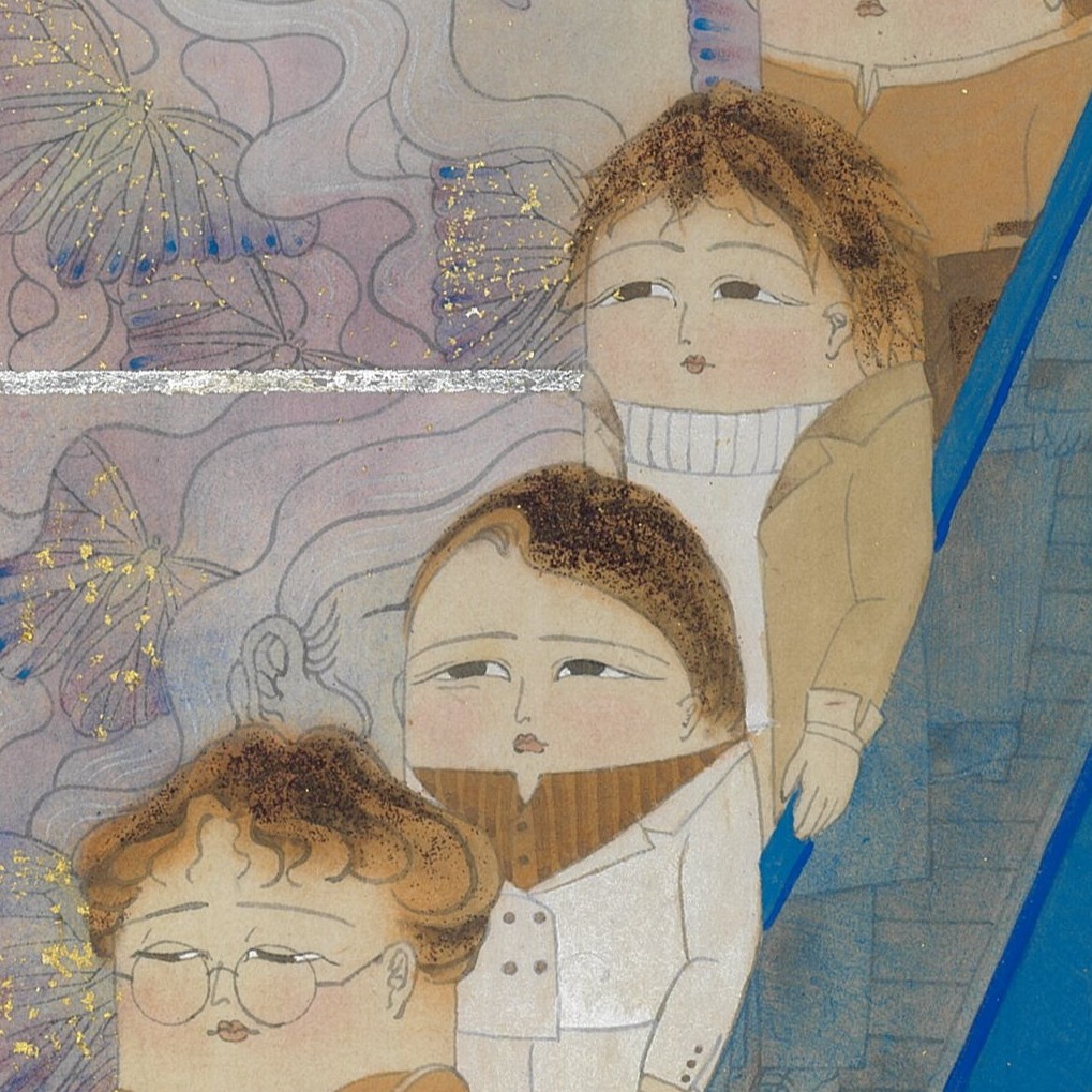 潘羽鍚善於將文學與圖像結合,以仿傳統水墨畫卷的形式,融入當代人物與場景,營造出既古典又新穎的觀看印象。其作品富含敘事性,並巧妙運用「印章」作為訴說載體,創造出可供觀者細細品味、充滿趣味的觀賞空間。