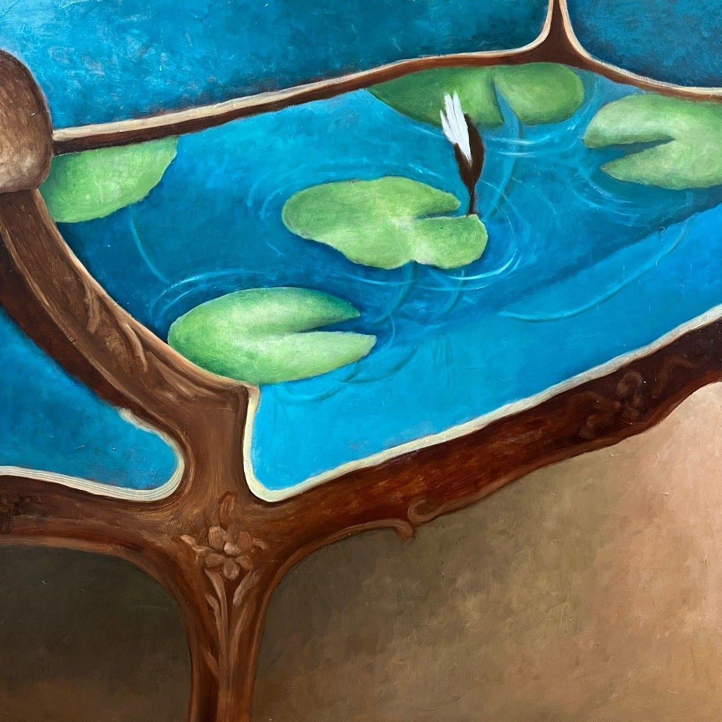 人們總是會對未知的未來而感到恐懼,卻又高估了即將要面對的問題。在藝術家的想像中,那些未來的問題猶如鏡花水月,看似存在,實際上卻難以捉摸、虛幻飄渺。〈水月鏡花〉系列的作品以鏡像構圖呈現,試圖揭示事物表象的虛幻性。作品結合蓮花的祝福寓意,期待人們可以在經歷挫折之後,仍能以高度的智慧,以真誠的心來面對未來。