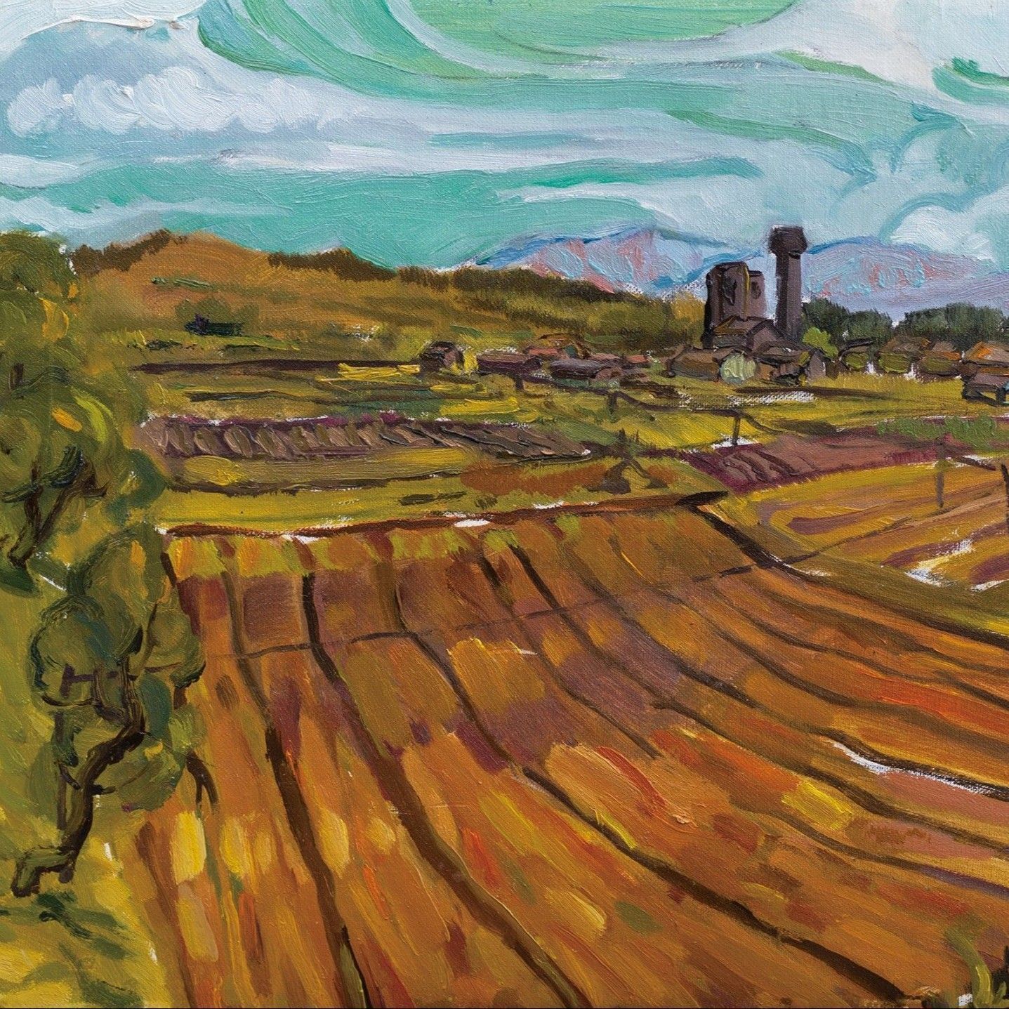 在這件作品裡,藝術家創造了一個井然有序的畫面,筆直的道路切割了整齊的塊面,橘紅和翠綠的色彩在鄉野之間形成有趣的秩序感。